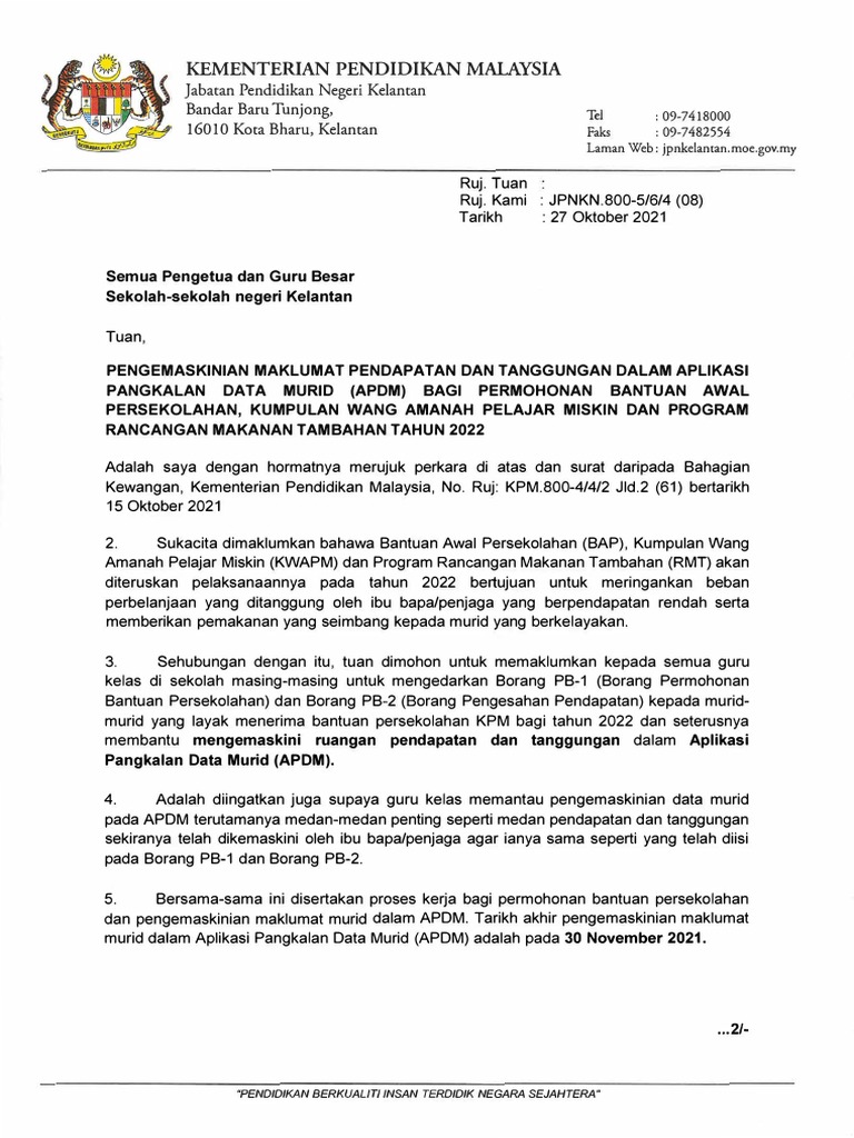 Tarikh Oe 2020 Sty Semua Pengarah Pendidikan Jabatan Pendidikan Negeri TuanPuan PENGEMASKINIAN MAKLUMAT DALAM APLIKAS. Supaya mengemaskini maklumat data murid di dalam APDM mulai tarikh surat ini diterima sehinqqa 28 September 2018 iam 12 tenqahari. KEMENTERIAN PENDIDIKAN MALAYSIA Jabatan Pendidikan Negeri Kelantan Bandar Barn Tunjong 16010 Kota Bharu.